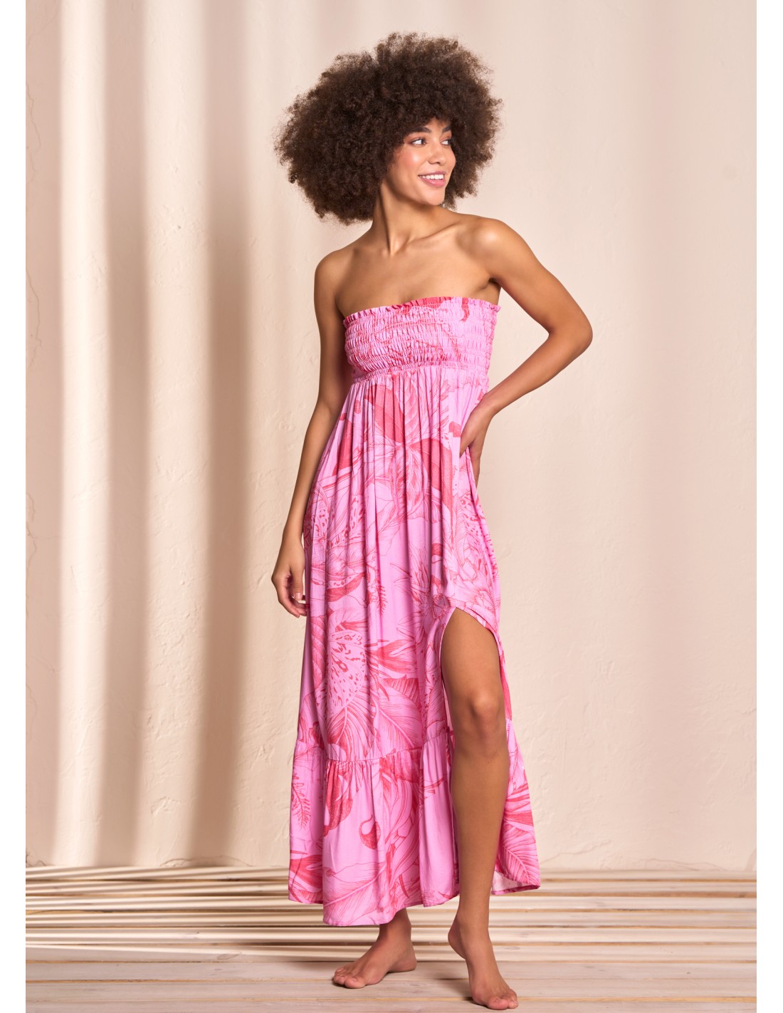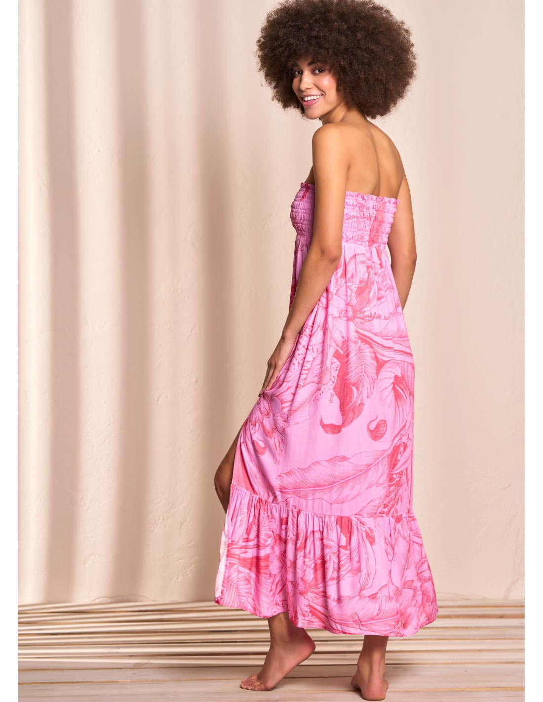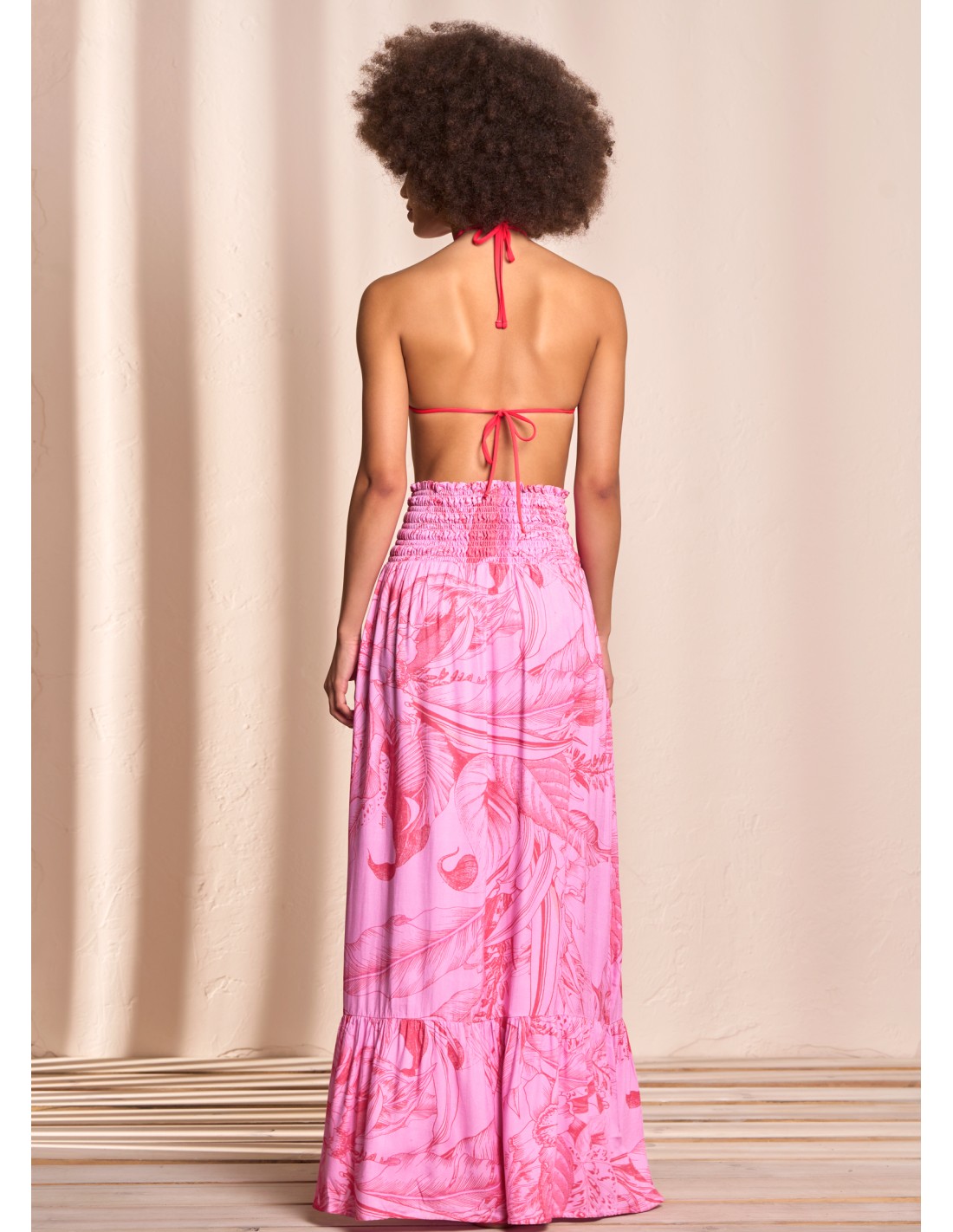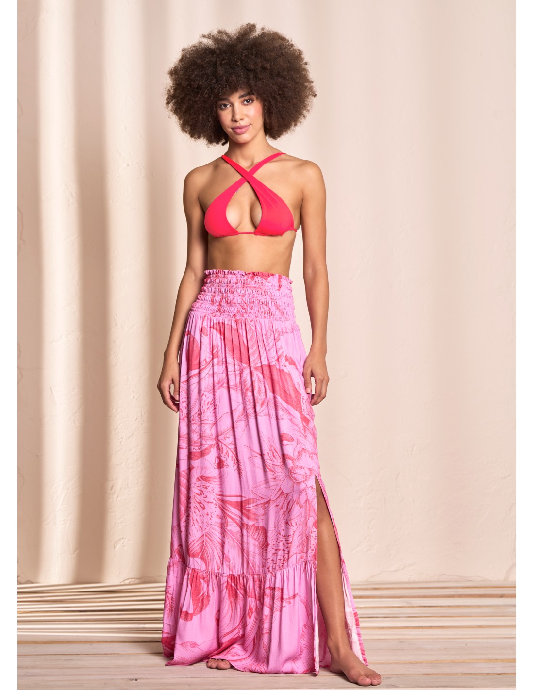 2 formas de usar Pretina encauchada Falda larga Abertura en frente Pompon decorativo Relajado Tela muy suave y ligera Tejido plano en Rayon Print floral Hecho en Colombia